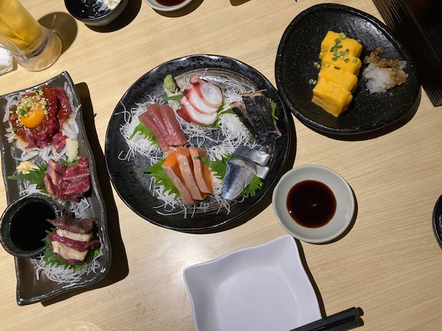 馬刺し盛り合わせと刺し盛りのサーモンが美味でした💓